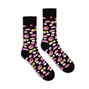 Skarpety sushi. Śmieszne skarpetki dla fanów dobrego jedzenia, w tym sushi - różne rodzaje kolorowych kawałków sushi na czarnym tle. Możesz założyć je zarówn...