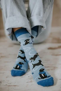 Historia pewnego kundelka Skarpetki Kundelek to coś więcej niż zwykły wzór – to mała opowieść o życiu czworonożnego przyjaciela. Od maleńkiego szczeniaczka, przez pełnego energii odkrywcę świata, aż po starszego, spokojnego pupila, który zna już wszystkie ścieżki i zawsze wraca do domu. Każdy etap życia kundelka to inny rozdział tej historii – pełnej radości, wierności i miłości bez warunków. Niebieskie tło symbolizuje spokój i zaufanie, a ciemne akcenty dodają całości elegancji. To idealne skarpetki dla tych, którzy wiedzą, że kundelki to prawdziwe skarby – mądre, lojalne i zawsze gotowe na przytulanie.