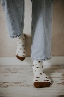 Klasyka i ciepło w psim stylu Skarpetki z motywem pudelków w wersji kremowo-brązowej to idealne połączenie przytulności i elegancji. Na jasnym tle pojawiają się urocze, drobne sylwetki piesków w odcieniach brązu, które dodają całości ciepłego, sympatycznego charakteru. To wzór, który zachwyci każdego miłośnika zwierząt i subtelnych dodatków. Neutralna kolorystyka sprawia, że skarpetki świetnie komponują się zarówno z jeansami i sneakersami, jak i z bardziej eleganckimi stylizacjami. To drobiazg, który potrafi wnieść odrobinę radości i uroku do codziennego stroju.
