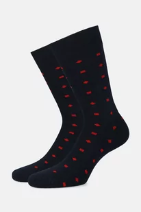 Granatowe skarpety z delikatnym wzorem. Wykonane z wytrzymałej i przyjemnej w dotyku dzianiny z przewagą bawełny i nieznaczną domieszką poliamidu oraz elasta...