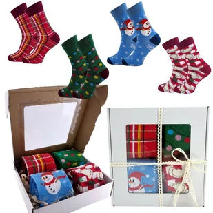 41-43 Ilość par w zestawie: 4 Fason: Długie Kolor: Multikolor Wzór: kratka świąteczna, pierogi, choinka, bałwanki. Materiał: 80% Bawełna, 17% Poliamid, 3% Elastan Rodzaj: