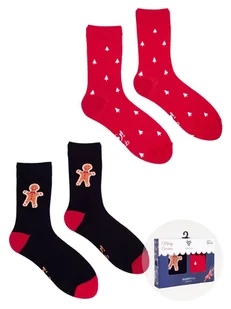 Świąteczny wzór Miłe i elastyczne 2-pak – ekonomiczne i wygodne rozwiązanie Eleganckie opakowanie – kartonowe pudełeczko Skarpety świąteczne w praktycznym dwupaku. W dwóch kolorach: czerwonym i czarnym z motywem ciastka i choinek. Skarpety są miłe w dotyku, dobrze układają się na stopie. Uszyte z miękkiego i zarazem wytrzymałego materiału, który gwarantuje duży komfort noszenia.