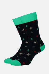 Świąteczne skarpety w granatowo-seledynowym kolorze z drobnym wzorkiem w śnieżynki, renifery i choinki. Wykonaliśmy je z wytrzymałej i przyjemnej w dotyku dzianiny z przewagą bawełny i nieznaczną domieszką poliamidu oraz elastanu, dzięki czemu skarpety są trwałe i zachowują pożądany kształt po długim użytkowaniu oraz wielokrotnym praniu. Najważniejsze cechy skarpet świątecznych granatowo-seledynowych w renifery, śnieżynki i choinki to: higiena i zdrowie stóp nawet po całodziennym użytkowaniu, dzięki zawartości bawełny wygodny ściągacz i płaski szew, które dają doskonały komfort użytkowania trwały kolor gładka i przyjemna w dotyku dzianina oraz znakomita wytrzymałość. Kolorowe skarpety z oryginalnym motywem będą świetnym dodatkiem do bawełnianych chinosów lub jeansów LANCERTO.