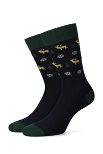 Skarpetki świąteczne męskie, w kolorze granatowym w renifery. Wykonane zostały z wytrzymałej dzianiny z przewagą bawełny i nieznaczną domieszką poliamidu, po...