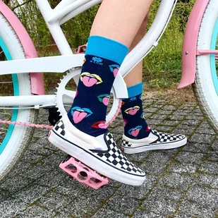 Śmieszne skarpetki w usta z językami na granatowym tle Każdy, kto chce się wyróżnić, znajdzie tu swój własny ulubiony język :) Różnorodność kolorów daje możl...