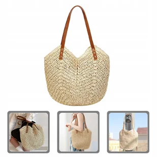 BOHO SŁOMKOWA TORBA PLAŻOWA PIKNIK SŁOMKOWY TOREBKA BEŻOWA PLECIONA