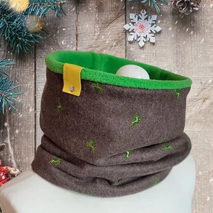 Bardzo starannie wykonany komin wykonany z 2 warstw materiału. Wierzchnia - bardzo miękka i ciepła brązowa wełna w haft w renifery, spód z miękkiego zielonego polaru. Komin zdobiony jest ręcznie tłoczon ...