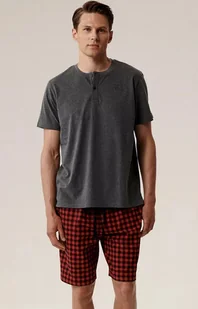 Atlantic bawełniana piżama męska NMP-397-SZMC_CZE to idealna propozycja dla mężczyzn ceniących komfort i klasyczny styl. Luźna koszulka w ciemnym szarym melanżu ma krótki rękaw, okrągłe wycięcie przy szyi i subtelne zapięcie na guziczki, a po lewej stronie zdobi ją niewielki napis ATLANTIC. Uzupełnieniem zestawu są czerwone spodenki w kratę o uniwersalnej długości, wyposażone w praktyczne kieszenie oraz wiązanie w pasie na szeroki sznurek, co gwarantuje pełną wygodę noszenia. Piżama wykonana jest z przyjaznej dla skóry dzianiny bawełnianej z dodatkiem poliestru w górnej części oraz w pełni