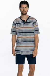 Męskia piżama CALEB to idealny wybór dla mężczyzn poszukujących połączenia komfortu, stylu i jakości. Ta piżama ma krótki rękaw i spodenki w eleganckim, ciemnoniebieskim kolorze, uzupełnione górną częścią ozdobioną paskami. Na dekolcie znajduje się zapinanie na małe guziki. Komfortowa piżama CALEB, wykonana ze 100% bawełny, jest dostępna w rozmiarach S, M, L, XL, XXL, 3XL i 4XL, dzięki czemu pasuje do każdej sylwetki. Każda piżama jest pakowana w eleganckie pudełko prezentowe.