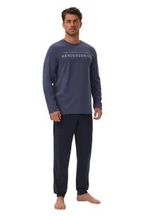 Piżama męska wykonana jest z wysokiej jakości 100% bawełny i posiada nadruk z logo Henderson. Piżama wykonana jest w 100% z bawełny. Ma niebieski kolor i biały nadruk z przodu. Koszulka od piżamy ma długie rękawy i okrągły dekolt. Spodnie od piżamy są ciemnoniebieskie.