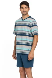 Nowoczesny styl i wygoda w jednym – taka jest piżama męska SALVADOR od hiszpańskiej marki GUASCH. Wykonana w 100% z delikatnej bawełny o gramaturze 140 g/m², zapewnia komfort i swobodę ruchów. Górna część w paski z dekoltem w serek łączy odcienie niebieskiego, szarości i turkusu. Gładkie, granatowe spodenki z praktycznymi kieszeniami są idealne do codziennego użytku. Produkt zapakowany jest w eleganckie pudełko prezentowe, dzięki czemu idealnie sprawdzi się również jako stylowy prezent.