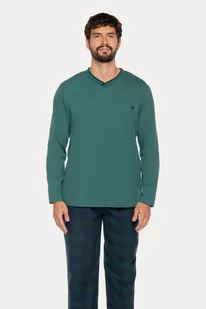 Piżama męska SANTIAGO ze spodniami flanelowymi Męska piżama SANTIAGO to idealny wybór na chłodniejsze dni. Łączy klasyczny wygląd z maksymalnym komfortem, który docenisz nie tylko podczas snu, ale także wieczornego wypoczynku w domu. Górna część z długim rękawem i dekoltem w serek wykonana jest w 100% z bawełny o gramaturze 250 g/m², dzięki czemu jest bardzo miękka, przyjemna w dotyku i ciepła. To samo dotyczy spodni, które są flanelowe, w eleganckim ciemnozielonym kraciastym wzorze. Piżama SANTIAGO dostępna jest w rozmiarach S, M, L, XL i XXL i zapakowana w pudełko prezentowe.