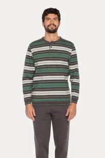 Postaw na wygodę i nowoczesny wygląd z męską piżamą SEBASTIAN. Wykonana w 100% z bawełny o gramaturze 190 g/m², miękka, trwała i idealna na chłodniejsze jesienne i zimowe wieczory. Certyfikaty OEKO-TEX Standard 100 i Recycled 100 potwierdzają bezpieczeństwo dla skóry i środowiska. Piżama składa się z prążkowanej koszulki z długim rękawem, zapinanej pod szyją na guziki i z praktycznymi kieszeniami, oraz spodni w kolorze ciemnoszarym z elastycznymi mankietami. Połączenie zielonych, szarych i białych pasków nadaje całości nowoczesny i ponadczasowy charakter.