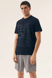 Dół piżamy wykonany jest z bawełny z domieszką wiskozy. Ma niebiesko-szary kolor. Spodnie są krótkie i mają gumkę w pasie. Piżamę otrzymasz w pudełku prezentowym. Piżama pochodzi z kolekcji Henderson Core.