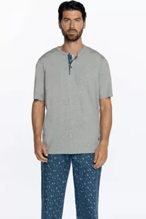Piżama męska THEODOR Męska piżama THEODOR łączy w sobie komfort, elegancję i jakość. Z krótkim rękawem i długimi spodniami jest idealnym wyborem na każdą porę roku. Górna część w kolorze szarym z trzema małymi guzikami przy dekolcie dodaje piżamie delikatnego i stylowego wyglądu. Dolna część w niebieskim kolorze i subtelnym wzorem wnosi świeżość i oryginalność. Ta piżama jest produkowana przez hiszpańską firmę GUASCH, która może poszczycić się długą tradycją w branży już od 1859 roku.