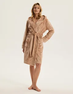 Szlafrok damski Cessena beżowy to połączenie elegancji i miękkiego komfortu, które sprawia, że codzienne chwile relaksu nabierają wyjątkowego charakteru. Jego średnia długość otacza sylwetkę harmonijną linią, a kaptur dodaje całości nowoczesnej funkcjonalności. Beżowa tonacja działa kojąco i rozświetla, dzięki czemu model doskonale podkreśla subtelny urok kobiecej figury. Pasek w talii umożliwia swobodne dopasowanie, a obszerne kieszenie nadają praktycznego wymiaru. To szlafrok, który idealnie sprawdzi się po kąpieli, jak i podczas spokojnych wieczorów w domowym zaciszu.