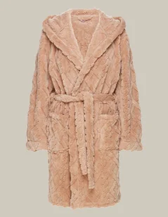 Ten ciepły szlafrok zwraca uwagę przede wszystkim nietypową fakturą materiału. Na całej długości jest pokryty subtelnymi wzorami przypominającymi warkocze. Na co dzień docenisz jednak przede wszystkim wygodę i ciepło, jakie zapewni Ci szlafrok Fredda. To idealne uzupełnienie piżamy lub koszuli nocnej w chłodniejsze dni – strój jest wykonany z przytulnej, mięsistej dzianiny. Szeroki kaptur będzie chronił Twoją głowę przed zimnem np.