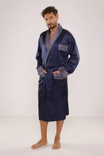Lekki szlafrok męski wykonany z satynowej tkaniny. Elegancki męski szlafrok satynowy w kolorze granatowym z długimi rękawami. W talii ma zawiązany pasek. Po bokach naszyte kieszenie. Zapakowany w pudełko.