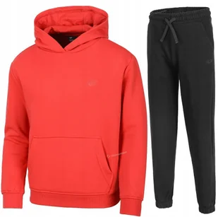 Chłopięcy dres sportowy 4F Marka/model: 4F JSWSM182 / JTROM1188 Kolor: Bluza czerwona / spodnie czarne Materiał: 80% bawełna, 20% poliester, Ocieplane wnętrze bluzy Nieocieplone wnętrze spodni 2 kieszenie boczne w bluzie Kieszenie spodnie: 2 otwarte Ściągacz na dole i przy rękawach Zintegrowany kaptur O marce: