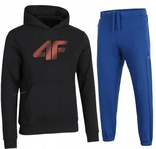 Męski dres sportowy 4F Marka/model: 4F SWSM1766 / TROM1348 Kolor: Bluza czarna / spodnie granatowe Materiał bluza: 80% bawełna, 20% poliester Materiał spodnie: 80% bawełna, 15% poliester, 5% elastan Ocieplane wnętrze bluzy Nieocieplane wnętrze spodni Kieszenie bluza: