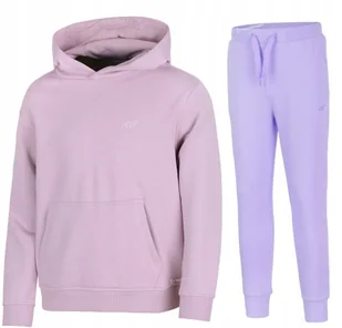 Dziewczęcy dres sportowy 4F Marka/model: 4F JSWSF1953 / JTROF515 Kolor: Bluza jasna różowa / spodnie fioletowe Materiał: 80% bawełna, 20% poliester, Ocieplane wnętrze bluzy i spodni Kieszeń typu kangurek w bluzie Kieszenie spodnie: 2 otwarte Ściągacz na dole i przy rękawach Sznurek w pasie Zintegrowany kaptur O marce: