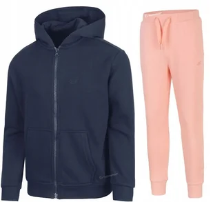 Dziewczęcy dres sportowy 4F Marka/model: 4F JSWSF1861 / JTROF515 Kolor: Bluza granatowa / spodnie koralowe Materiał: 78% bawełna, 22% poliester, Ocieplane wnętrze bluzy i spodni 2 kieszenie w bluzie Kieszenie spodnie: 2 otwarte Ściągacz na dole i przy rękawach Sznurek w pasie Zintegrowany kaptur O marce: