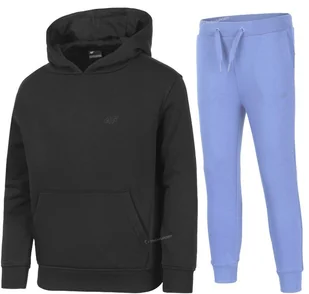Dziewczęcy dres sportowy 4F Marka/model: 4F JSWSF1862 / JTROF515 Kolor: Bluza czarna / spodnie denimowe Materiał: 78% bawełna, 22% poliester, Ocieplane wnętrze bluzy i spodni 2 kieszenie w bluzie Kieszenie spodnie: 2 otwarte Ściągacz na dole i przy rękawach Sznurek w pasie Zintegrowany kaptur O marce: