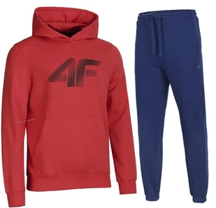 Męski dres sportowy 4F Marka/model: 4F SWSM1766 / TROM1140 Kolor: Bluza czerwona / spodnie granatowe Materiał: 80% bawełna, 20% poliester Ocieplane wnętrze bluzy i spodni Kieszenie bluza: typu kangurek Kieszenie spodnie: