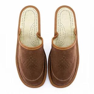 Męskie kapcie skórzane: welurowe Brązowe Kapcie męskie welurowe - parametry Wysokość obcasa: 12 mm Wysokość pod palcami: 5 mm Wzór: geometryczny, ażurowy Kol...