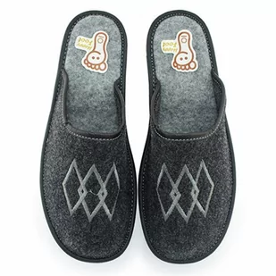 Męskie kapcie filcowe z ozdobną lamówką Grafitowe Kapcie filcowe męskie - parametry Wysokość obcasa: 12 mm Wysokość pod palcami: 5 mm Wzór: haftowany geometr...