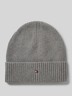 Beanie. Dzianina prążkowana. Z wywinięciem. Detale z marką