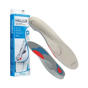 Wkładki FootWave HALLUX ból dużego palca Tzw. ,,haluks" to dolegliwość objawiająca się wykoślawieniem dużego palca oraz bólem w jego obrębie. Dynamiczne wkładki ortopedyczne usuwają skutki tego schorzenia (ból, stan zapalny), zatrzymują rozwój haluksów, ale przede wszystkim usuwają przyczynę ich powstawania stabilizując i przywracając prawidłową pracę tyłostopia. Pomaga na schorzenia: -paluch koślawy (hallux valgus); -paluch ograniczony (hallux limitus); -paluch sztywny (hallux rigidus); -koślawość (nadmierna pronacja); -płaskostopie; -ból pięty; Hallux, czyli paluch koślawy (lub sztywny/ograniczony) to dolegliwość powstająca na wewnętrznej stronie stopy, której towarzyszy krzywienie dużego palucha, a dokładniej bolesna deformacja przodostopia na poziomie I-szego stawu śródstopno -paliczkowego (MPT I).