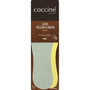 Wkładki do butów latex yellow&green coccine 43-44 Wkładka wykonana z dwóch rodzajów lateksu perforowanego pokrytych bawełną: zielonego perfumowanego olejkiem sosnowym oraz żółtego, przeciwpoślizgowego, z fakturą rombów. Zapewnia amortyzację, jest miękka i bardzo wytrzymała. Dzięki perforowaniu zapewnia cyrkulację powietrza i pozwala stopom swobodnie oddychać i daje poczucie komfortu. Zalecana szczególnie do obuwia sportowego.