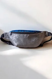 Duża nerka saszetka biodrowa w kolorze szarym wykonana z połyskującej tkaniny. Klapa z granatowego weluru w róże. Nerka zapinana jest na suwak i zamocowana na czarnym, parcianym pasie o regulowanej dług ...