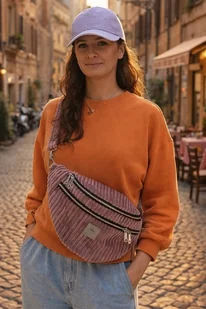 Bardzo duża nerka torebka damska ze sztruksu tapicerskiego Kultowy gadżet przydatny w czasie wszelkich wycieczek, koncertów i festiwali. Oryginalny materiał z fakturą w szeroki prążek przyciąga wzrok. ...