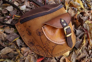 Praktyczna torebka na pas uszyta z jasno i średnio brązowych skór naturalnych o różnych odcieniach i fakturach. Ręcznie wypalone dmuchawce. Niewielka ale pojemna, pomieści telefon, portfel, chuste ...