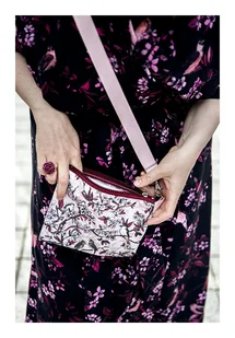 TOREBKA mini z dopinanym paskiem / ORGANIZER różowy w autorski print SŁOWIKI w kwiatach wiśni (100% sztywna bawełna)