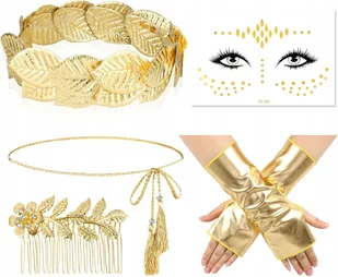 Harmonijny zestaw zawiera złotą grecką tiarę (wieniec), spinkę do włosów, złotą rękawiczkę i tatuaż na twarz, a wszystko to połączone połyskującymi złotymi odcieniami, które dodają odrobinę luksusu i wyrafinowania Twojej stylizacji. ➡️ WSZECHSTRONNOŚĆ ZASTOSOWANIA