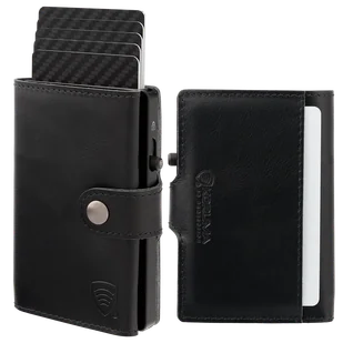 Połączenie aluminiowego etui z portfelem wykonanym z wysokiej jakości naturalnej skóry. Z miejscem na banknoty oraz kieszenią Tap&Go™. Bez podszewki, aby zachować minimalny rozmiar. Z podwójnym zabezpieczeniem kart (ochrona RFID oraz blokada kart).