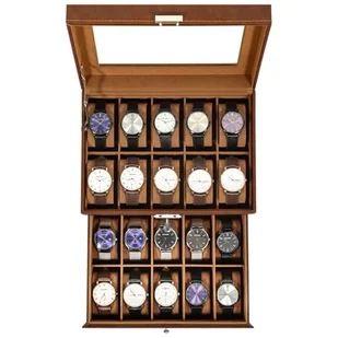 Uten Pudełko na zegarek, 20 przegródek, 2-poziomowe etui na zegarek z zamkiem na klucze, szklana pokrywka, pudełko do przechowywania zegarków dla mężczyzn i kobiet, brązowa skóra syntetyczna, brązowa