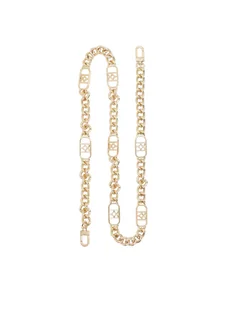 Dodatkowy, wymienny łańcuch do torebki to luksusowy akcent, który podkreśli charakter każdej stylizacji. Całość utrzymana jest w eleganckim, złotym odcieniu o wysokim połysku, co nadaje dodatkom szyku i biżuteryjnego wyrazu. Łańcuch zbudowany jest z masywnych, gęsto splecionych ogniw, które przeplatane są większymi elementami ozdobnymi – prostokątnymi ogniwami z wyciętymi monogramami, dodającymi projektowi prestiżowego charakteru. Wyposażony w solidne zapięcia umożliwiające łatwe przypięcie do różnych modeli torebek, ten łańcuch to nie tylko funkcjonalny, ale i dekoracyjny element, który pozwala w prosty sposób odmienić charakter klasycznej torebki – od codziennej po wieczorową.