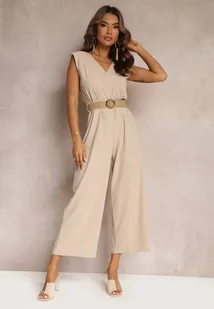 Beżowy Kombinezon Zapinany na Suwak z Poduszkami w Ramionach i Paskiem z Klamrą Bless