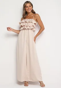 Beżowy Kombinezon Koktajlowy na Regulowanych Ramiączkach z Falbankami i Gumką w Pasie Tesvia
