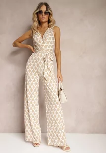 Beżowy Kombinezon o Taliowanym Kroju z Trójkątnym Dekoltem i Paskiem w Talii Geranea