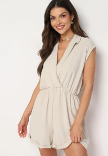 Beżowy Kombinezon z Nakładkowym Dekoltem i Gumką w Talii Nansaliah
