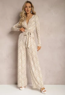 Beżowy Kopertowy Kombinezon z Paskiem w Talii i Ozdobnym Wzorem Mirannda