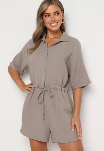Ciemnobeżowy Muślinowy Kombinezon z Bawełny Wiązany w Talii z Guzikami Dlirena