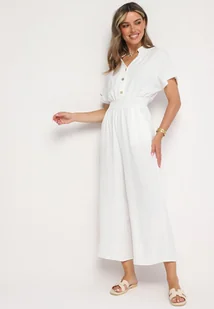 Biały Wiskozowy Kombinezon o Taliowanym Kroju z Szerokimi Nogawkami Delsea