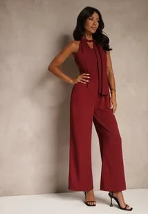 Bordowy Kombinezon Wide Leg z Ozdobnym Wiązaniem przy Szyi Silelia