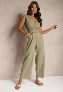 Ciemnozielony Bawełniany Kombinezon z Kopertowym Dekoltem Paskiem z Klamrą i Gumką w Talii Risalen